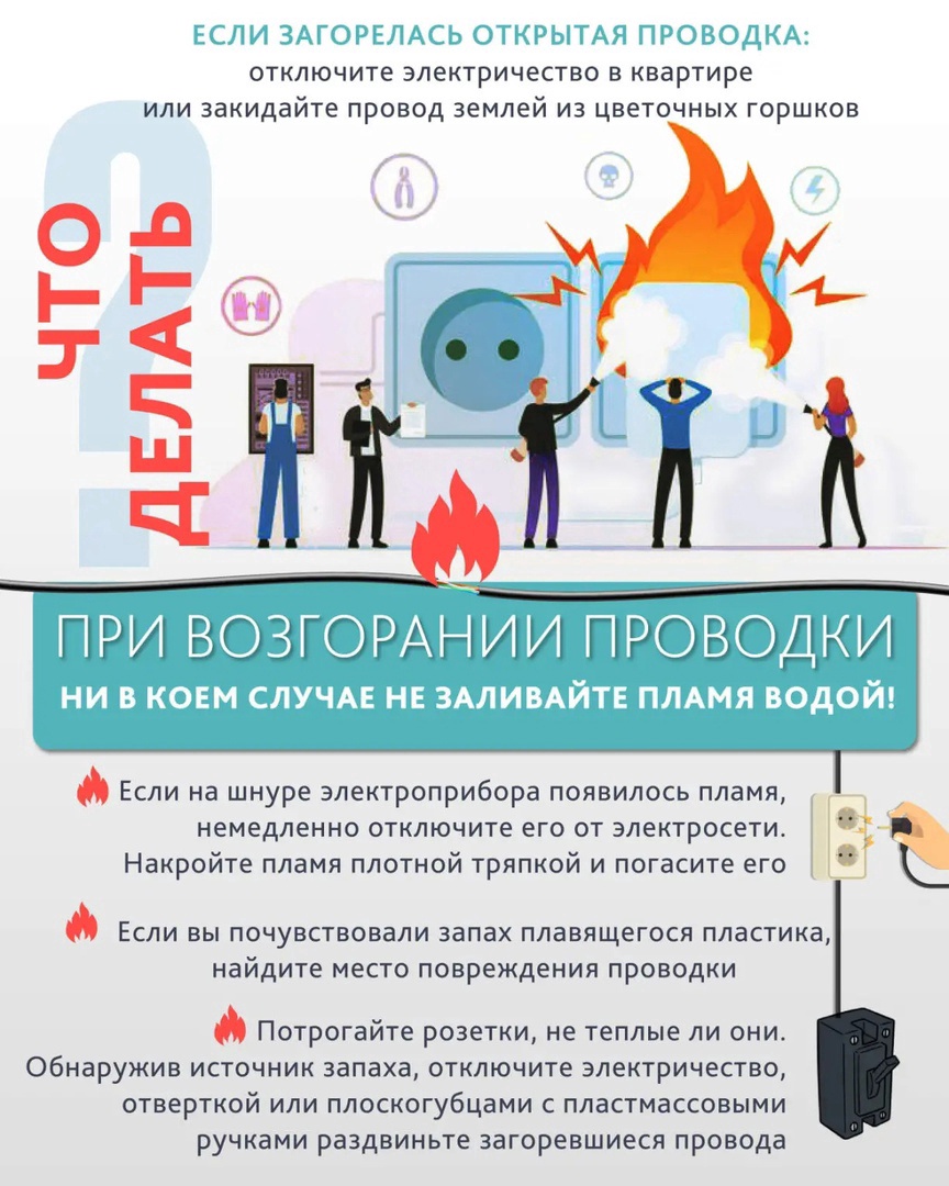 - Постарайтесь погасить огонь, вызвать пожарных и спасателей.